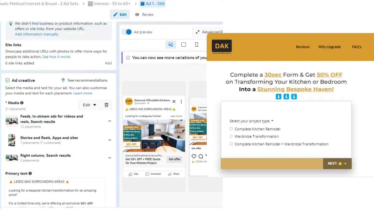 Diamond Affordable Kitchens, was facing a slow month with little to no business at all. The client's goal was clear, getting new business as asson as possible. We aimed to create a customised lead generating system for the client, not only to overcome the slow month, but to ensure a steady flow of business for long to come.